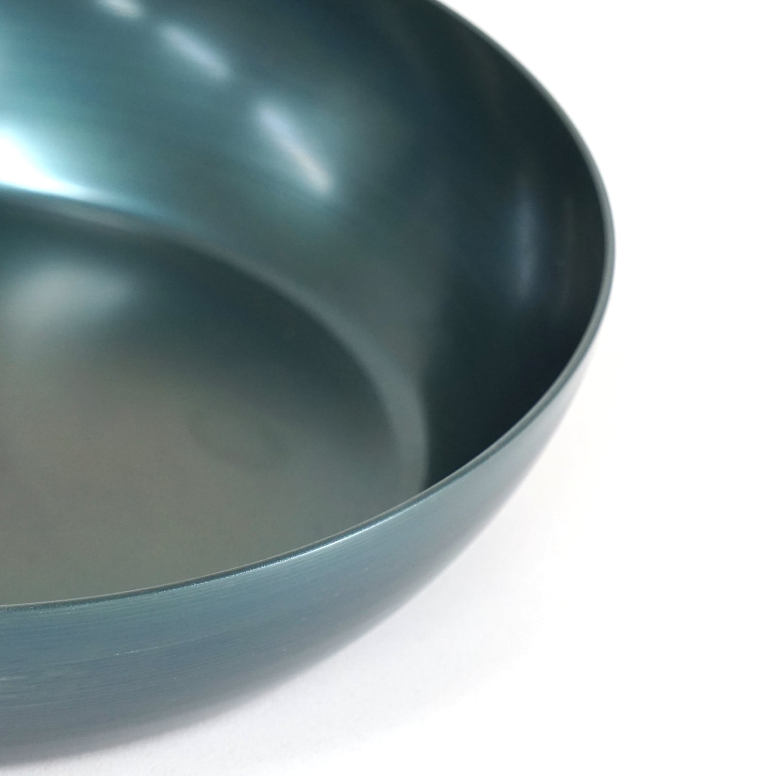 ヘラ絞り加工とは、「ヘラ絞り機」という機械に平らな金属板をセットし、高速回転させた金属板に対して「ヘラ」という工具をを押し付けることで、ゆっくりと伸ばし、フライパンの形を作っていきます。側面を薄く伸ばすことで、プレス加工などの他の製法の鉄フライパンより軽く仕上げることができます。